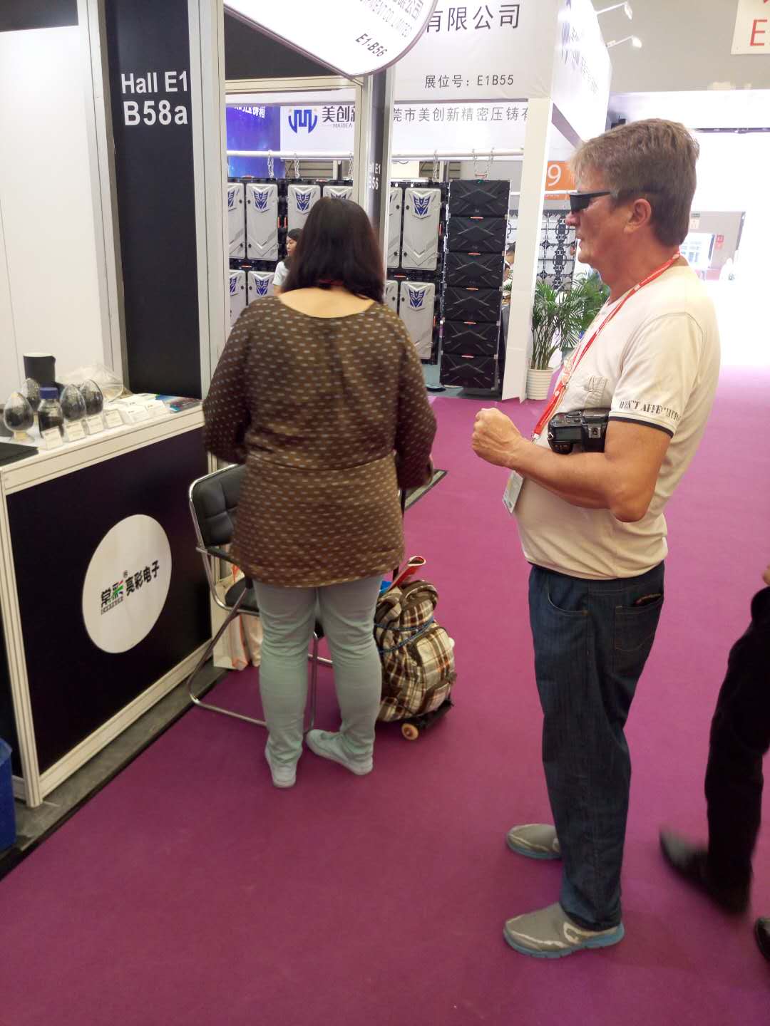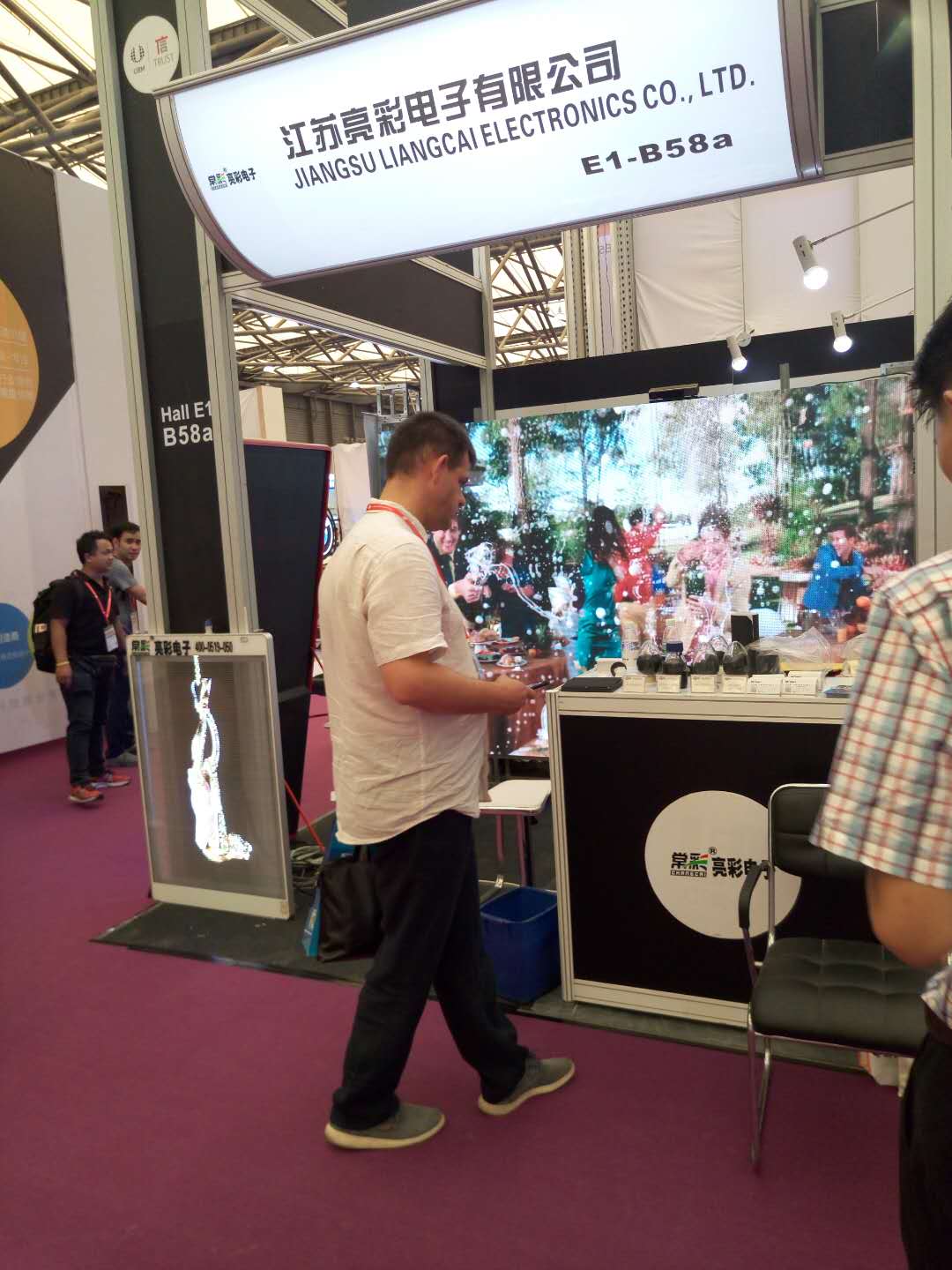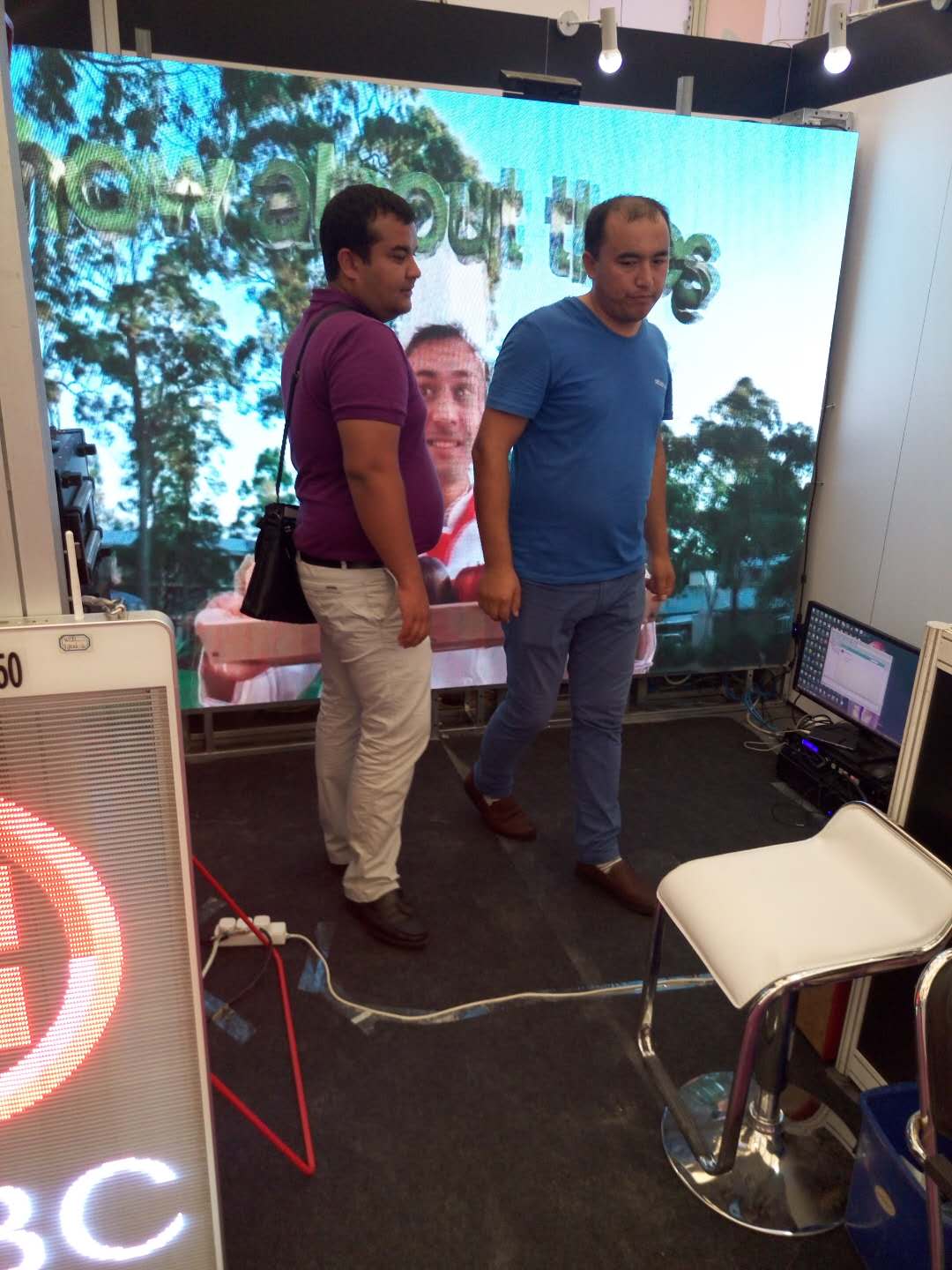 In the booth, there have been many international friends coming to consult. The LED+3D screen products on the live demonstration are also very popular, and they all stop to watch.