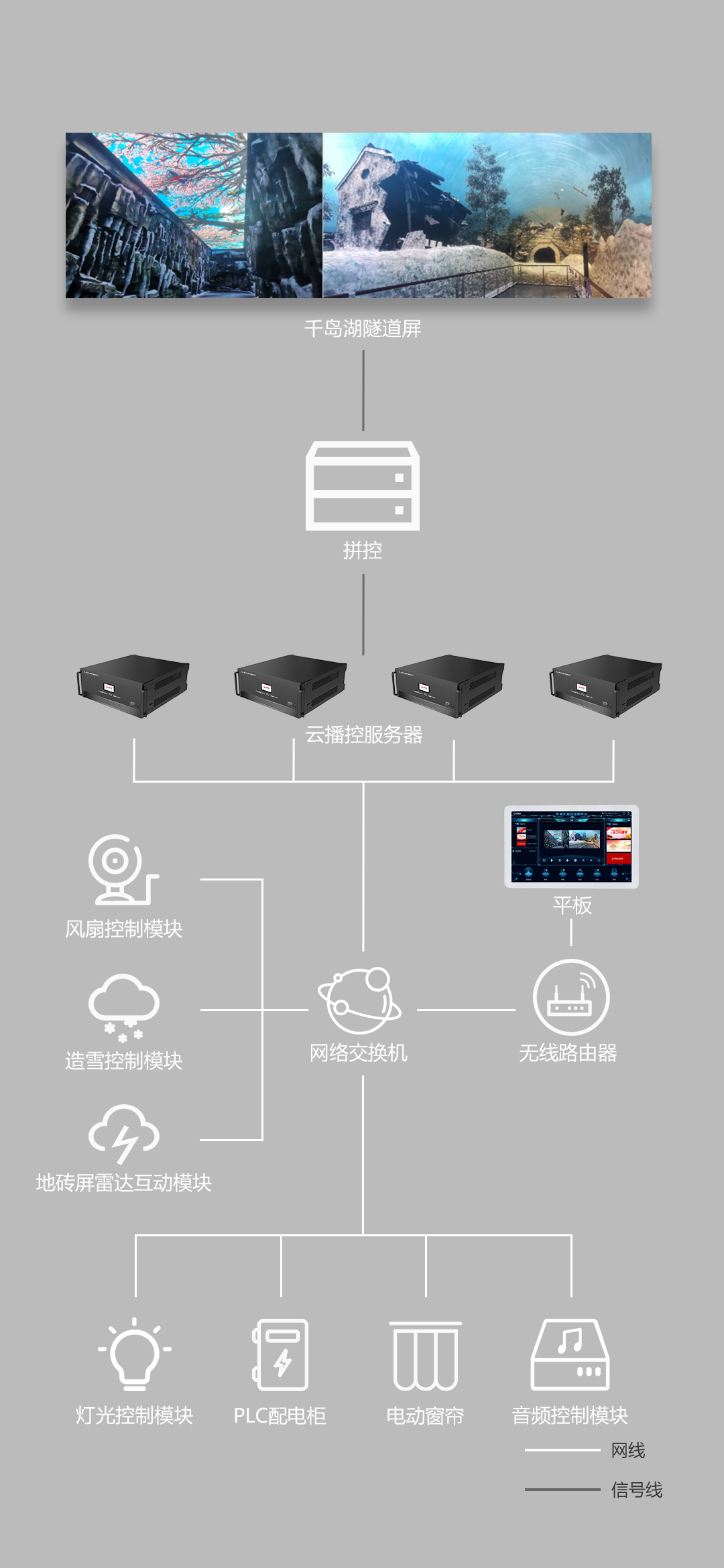 云播控服務器具有強大的異形拼接功能,可以根據在軟件內建立虛擬屏幕,完全模擬實際的屏幕形狀及布局情況,結合素材呈現出千島湖隧道屏令人震撼的沉浸式裸眼3D的視覺效果。
